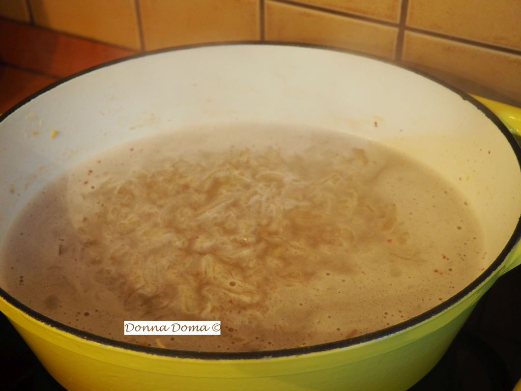 Felöntöm kb. 2 liter vízzel, sózom, borsozom, nem pánikolok, amikor látom, hogy nagy csomókba állt össze a liszt, hanem kézi habverővel csomómentesre keverem benne a lisztet.