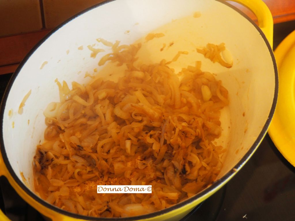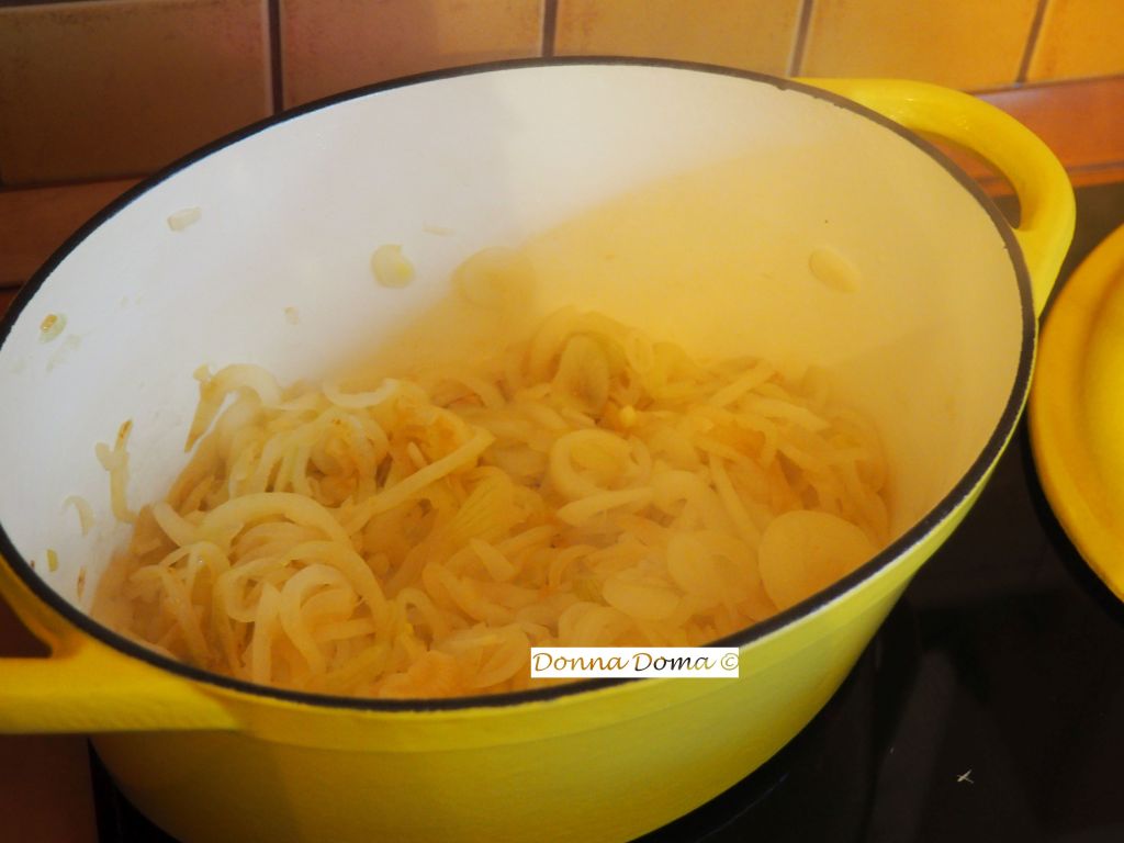 A hagymát nagyon vékonyan felkarikázom. Egy nagy tefonfazékban felhevítem az olajat, és nagy lángon kevergetve addig pirítom a hagymát, míg aranybarna lesz. Ha nagyon pirul, kicsit lejjebb vesszük a lángot, de fontos, hogy rászánjuk az időt (minimum 20 perc), mert így lesz szép színe és finom íze a levesnek.