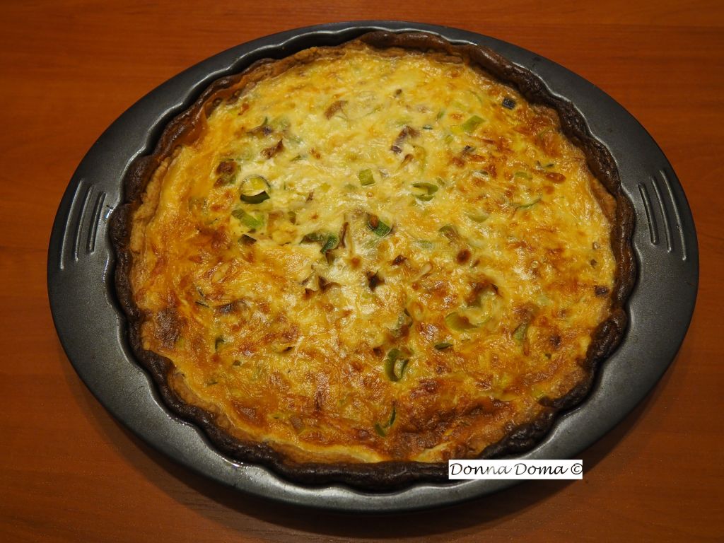 - Egy tálba öntöm a tejszínt, beleütöm a tojásokat, a reszelt sajt ⅔-át, sóval, borssal, szerecsendióval fűszerezem és habverővel felverem. Végül a kihűlt póréhagymát is belekeverem.