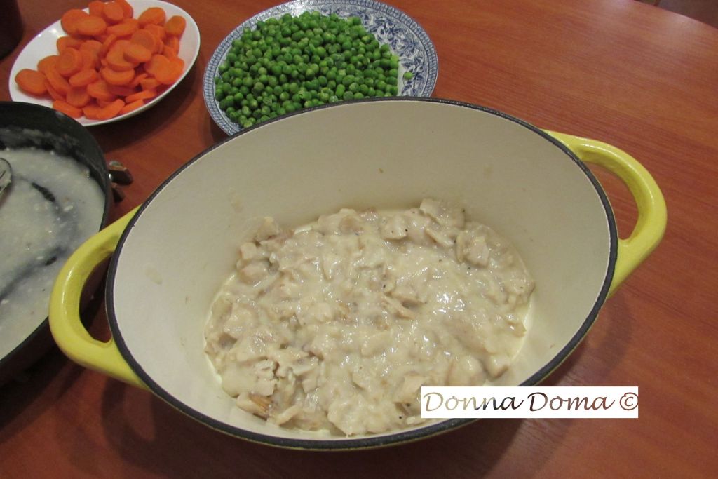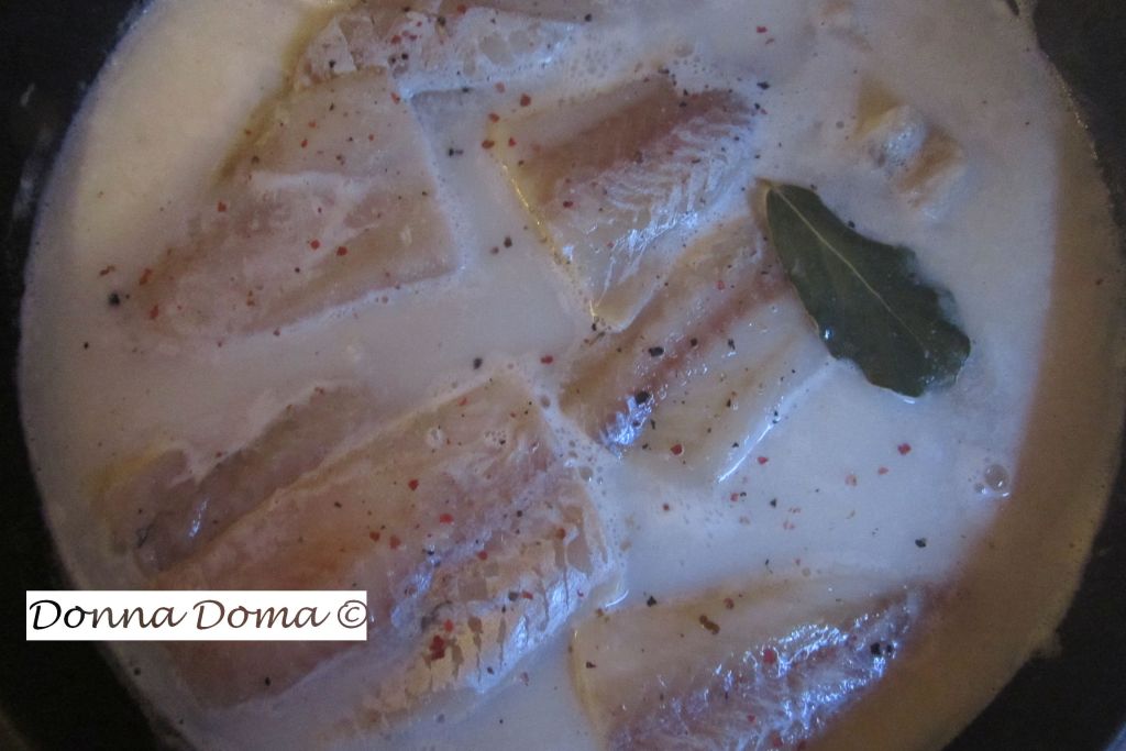 Forralok egy fazék sós vizet, és ha forr, beledobom a zöldborsót. Közben megpucolom és vékonyan felkarikázom a sárgarépát. Ha puha a zöldborsó, leszűröm egy tálban, és ugyanabban a vízben megfőzöm a sárgarépát. Amíg fő, meghámozom, megmosom és apróra felkockázom a burgonyát. A sárgarépát is leszűröm egy másik tálban, és a forró vízben teljesen puhára főzöm a burgonyát (ha villával megszúrom, szét kell esnie). Közben egy tapadásmentes serpenyőben, amiben elfér a hal, 5 dl tejet vagy rizstejet babérlevéllel, sóval, borssal ízesítek, felforralok és beleteszem a fagyos halszeleteket.