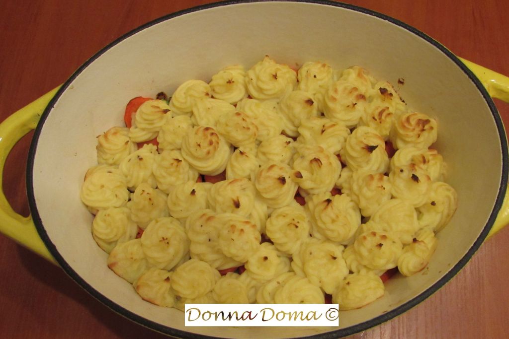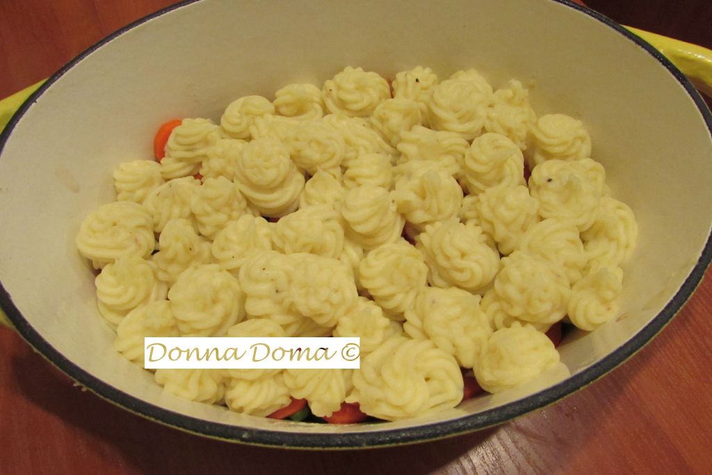 A puhára főtt burgonyát a mártásba rakom, öntök még rá 1 dl tejet vagy rizstejet, sóval, borssal ízesítem és kézi robotgéppel teljesen homogén pürét készítek belőle. Előmelegítem a sütőt 180 fokra. Amíg melegszik, a pürét habzsákba kanalazom és a legnagyobb lyukú rózsájával csinos halmokat nyomok a sárgarépa tetejére. Kb. 20 perc alatt sül szép pirosra.