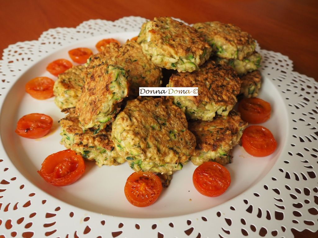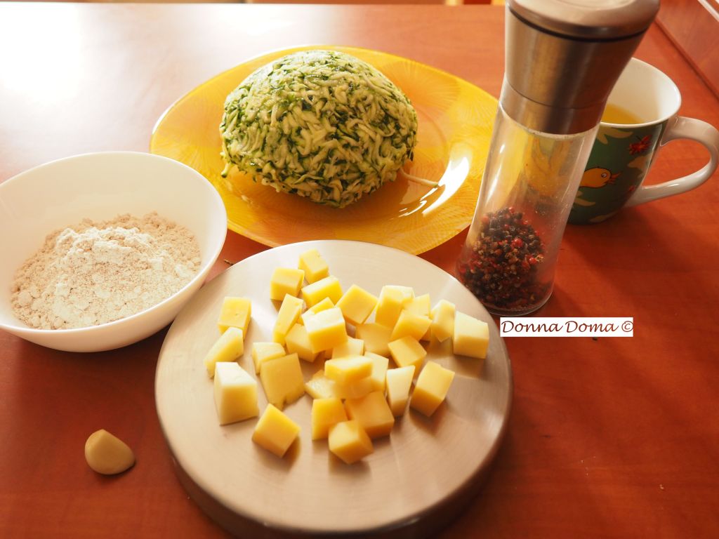 A cukkinit megmosom, két végét levágom és almareszelőn lereszelem. Besózom és pár percig állni hagyom. Ezalatt dobókocka méretűre felkockázom a sajtot. Ezután belegyömöszölöm a cukkinit egy sűrű (hálós) szűrőbe és jó 10 percre magára hagyom, míg kb. egy bögrényi levet ereszt. Közben egy teflonserpenyőben felhevítek egy evőkanál olivaolajat, félbevágom a koktélparadicsomokat és vágott felével lefelé megpirítom, majd kiszedem. A serpenyőbe beledobom a kókuszzsírt és felhevítem. Amíg melegszik, gyorsan összeállítom a fasírtot: a kicsöpögött cukkinihez hozzákeverem a tojást, az egyik kipréselt fokhagymagerezdet, majd a zablisztet és zabpelyhet és borsozom. Nem kell szilárd, gyúrható, formázható masszának lenni, mert akkor túl lisztes lesz a végeredmény. A lágy masszából diónyinál kicsit nagyobb mennyiségeket veszek, közepébe nyomok egy sajtgolyót, majd közvetlenül a forró kókuszzsírba teszem és kicsit lelapítom. Ha pirosra sült, megfordítom, újra lelapítom. Tálra szedem, fokhagymás-sós joghurttal és a sült koktélparadicsommal kínálom.