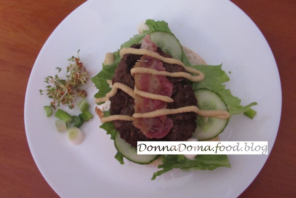 A bacon mindkét oldalát egy nagyobb teflonserpenyőben pirosra sütöm, kiszedem egy tányérra és lefedem, hogy ne hűljön ki. Ugyanebben a serpenyőben, a bacon zsírján jó sötétre megsütöm a húspogácsákat, rászedem a baconra és újra lefedem.