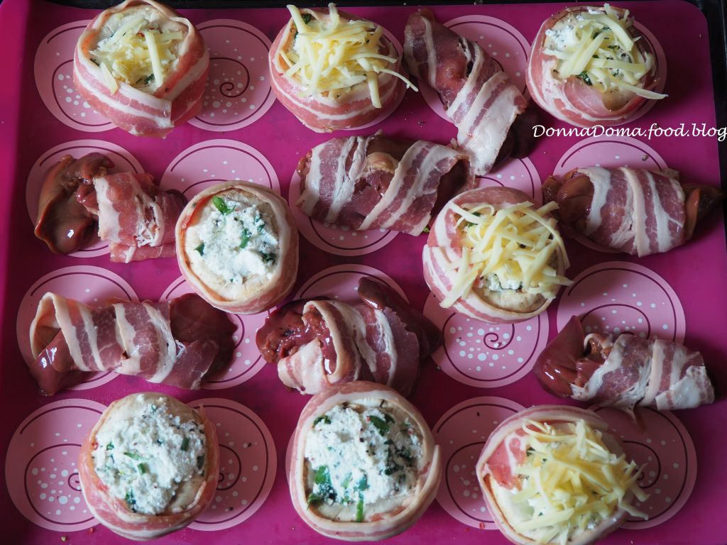 A gombák szárát letöröm, és elteszem a másnapi gombás rántottához :-). A fejeket megmosom és papírtörlőre leborítom száradni. Előmelegítem a sütőt 180 fokra, légkeverésre. A túrót kikeverem az apróra vágott metélőhagymával, petrezselyemmel, mustárral, sóval, borssal. A gombafejeket minden oldalon kicsit besózom, majd egy evőkanál segítségével szétosztom bennük a túrótölteléket, körbetekerem az oldalát egy-egy baconszelettel, és sütőpapírral bélelt tepsibe sorakoztatom, majd mindegyiknek teszek egy csipetnyi reszelt sajtot a tetejére. Nekem volt pár csirkemáj a hűtőben, ezeket is betekertem baconnel és mellétettem a tepsiben. Szűk fél óra alatt sült meg. Akkor jó, ha a gomba puha, a bacon pedig ropogósra, pirosra sült.