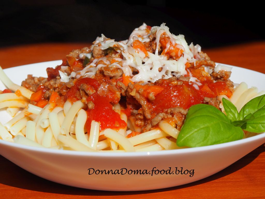 Felteszünk egy nagy fazék vizet egy evőkanál sóval forrni. A sárgarépát megpucoljuk és lereszeljük vagy aprítógépben felaprítjuk. A zsiradékot feltesszük egy nagy teflonban melegedni. A vöröshagymát megpucoljuk és apró kockákra vágjuk vagy aprítógépben felaprítjuk. A forró zsiradékban üvegesre pároljuk, majd rányomjuk a meghámozott fokhagymagerezdeket. Pár másodpercig pirítjuk, majd rászórjuk a répát, és picit együtt pirítjuk. Rátesszük a darált húst és addig sütjük kevergetve, míg az egész fehérre nem sül és elfőtte a levét. Ekkor ráöntjük a paradicsomkonzervet, egy konzervdoboznyi vizet, a paradicsompürét, a cukrot, a sót, borsot és a zöldfűszereket. Felforraljuk, keverünk egyet rajta és lefedjük, majd takaréklángon kb. fél óra alatt puhára főzzük. Közben a felforrt vízbe beledobjuk a tésztát, ha felforrt, mérsékeljük a lángot és típustól függően 6-12 perc alatt al dente főzzük, majd leszűrjük és kevés zsiradékkal összekeverjük.