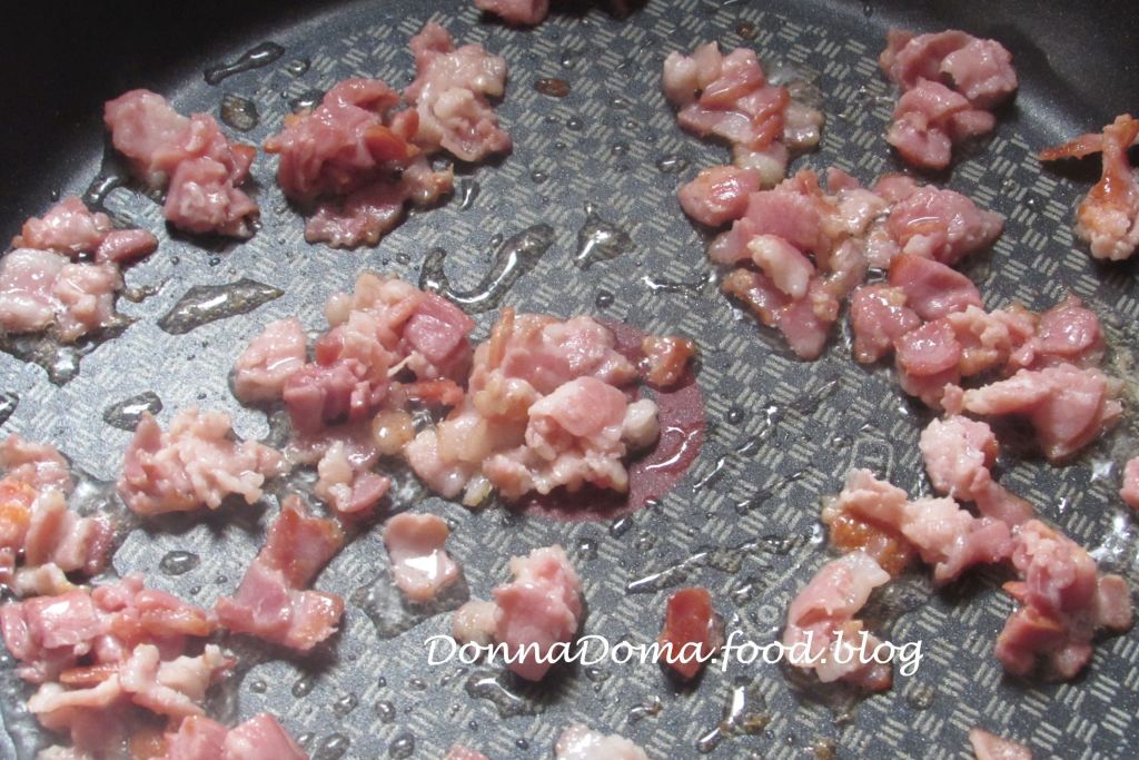 Közben a bacont picire felkockázom és teflonserpenyőben ropogósra sütöm. Amíg sül, felkockázom a hagymát is. Lyukas kanállal kiszedem a bacont egy tányérra, a zsírjába szórom a hagymát, közepes lángon egészen barnára sütöm, hogy karamellizálódjon. Lehúzom a lángról és a serpenyőben hagyom kihűlni.