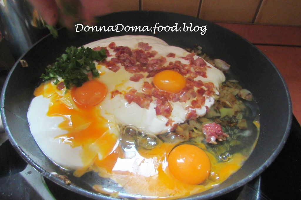 Apróra vágom a petrezselymet, felkarikázom a paradicsomot. Ha kihűlt a hagyma, beleszórom a bacont, ráütöm a tojásokat, ráöntöm a tejszínt, a petrezselymet, meghintem sóval, fehérborssal, szerecsendióval, és habverővel jól összekeverem, kissé fel is verem.