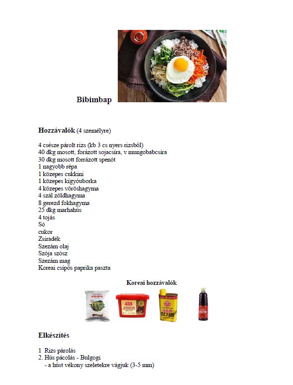 A miyeok guk (koreai születésnapos leves) után egy rengetegféle zöldségből, rizsből és kevés marhahúsból álló, szezámolajjal és csípőspaprika-pasztával megbolondított ételt, a bibimbapot készítettük el az Intézet vadonatúj tankonyhájában Beleznay Kati irányításával (alább láthatjátok a tőle kapott receptet is), majd mindenki megette, amit főzött 😉