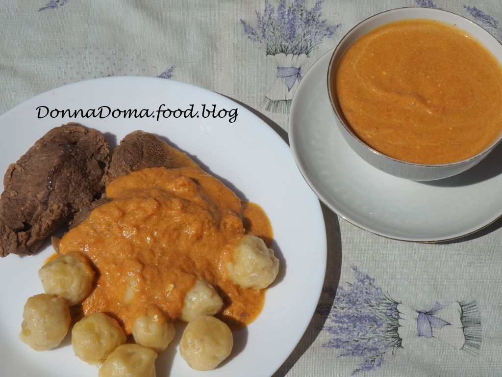 Amíg fő, a mártáshoz a sárgarépát megtisztítom, vékony karikákra vágom és annyi vízben, amennyi egy ujjnyira ellepi, fedő alatt puhára a főzöm. Ha megfőtt, botmixerrel pürésítem a főzővízzel együtt. Egy teflonserpenyőben a vajat felhevítem, beleszórom a cukrot és szép sötétbarnára karamellizálom. Ráöntöm a répapürét, mustárral, sóval, borssal, tejföllel ízesítem és folyamatosan kevergetve, kis lángon felforralom.