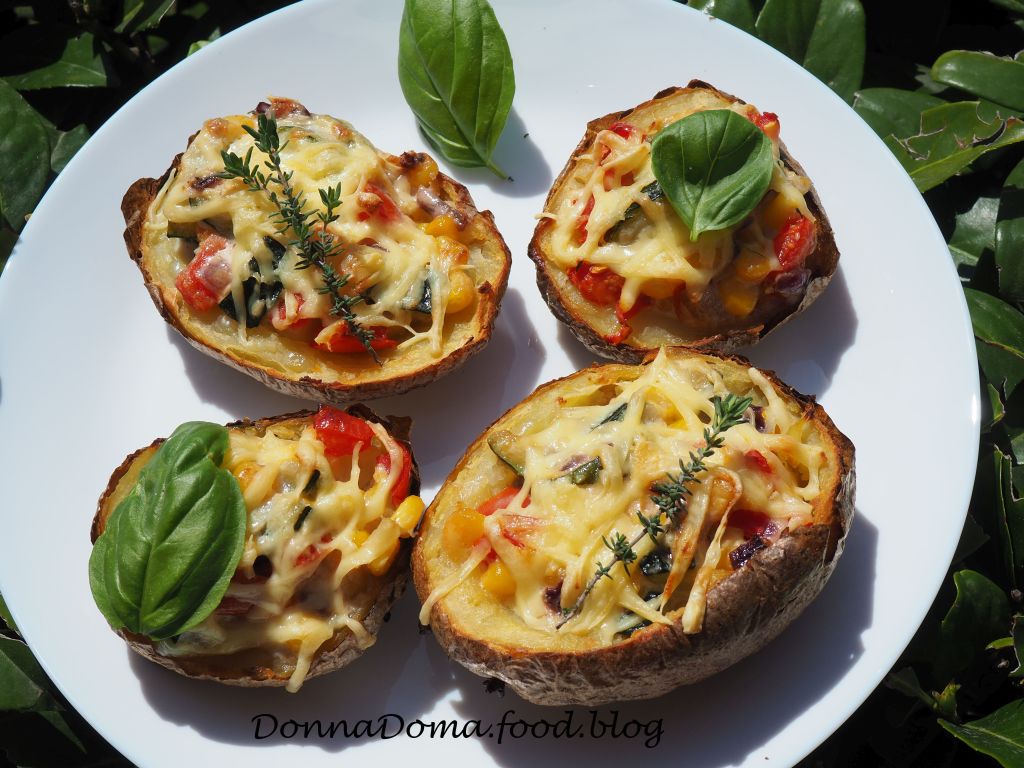 Előmelegítem a sütőt 200 fokra, légkeveréssel. A burgonyát erre a célra rendszeresített kefével vagy mosogatószivaccsal folyó víz alatt tisztára súrolom, megtörlöm, több helyen, minden oldalon megszurkálom villával, majd a teljes felszínét bekenem olajjal. A rácsra teszem kb. 1 óra alatt puhára sütöm. Ezalatt a belseje krémesen puha, a héja jó ropogós lesz. Amíg a burgonya sül, addig a lilahagymát apróra vágom és egy teflonserpenyőben felhevített olajon megpárolom. Közben felkockázom a cukkinit és a párolt hagymára szórom. Sózom, borsozom, lefedem és kis lángon puhára párolom. Közben pici kockákra vágom a paradicsom húsát, a magja és leve nélkül (hogy ne hígítsa fel a tölteléket). Ha a cukkini megpuhult, ráöntöm a főzőtejszínt, összeforralom, majd lehúzom a tűzről és belekeverem a kukoricát és a paradicsomot, ezt már nem kell főzni. Amikor a villa könnyedén beleszalad a burgonyába, kiveszem, deszkára szedve kicsit kihűtöm. Vízszintesen tartva a kést félbevágom a burgonyákat, egy kis tálba kikanalazom a belsejét, kb. kisujjnyi vastagon meghagyok egy csónakot. Ezt púposan megtöltöm a párolt zöldségkeverékkel, tetejére reszelt sajtot szórok és kb. 20 percre visszatolom a 180 fokra lecsavart sütőbe. Amikor megolvadt és kicsit pirosra sült a tetején a sajt, kész. (a kikanalazott belső részt később felhasználom krumplipürének vagy krémleves, főzelék sűrítésére)