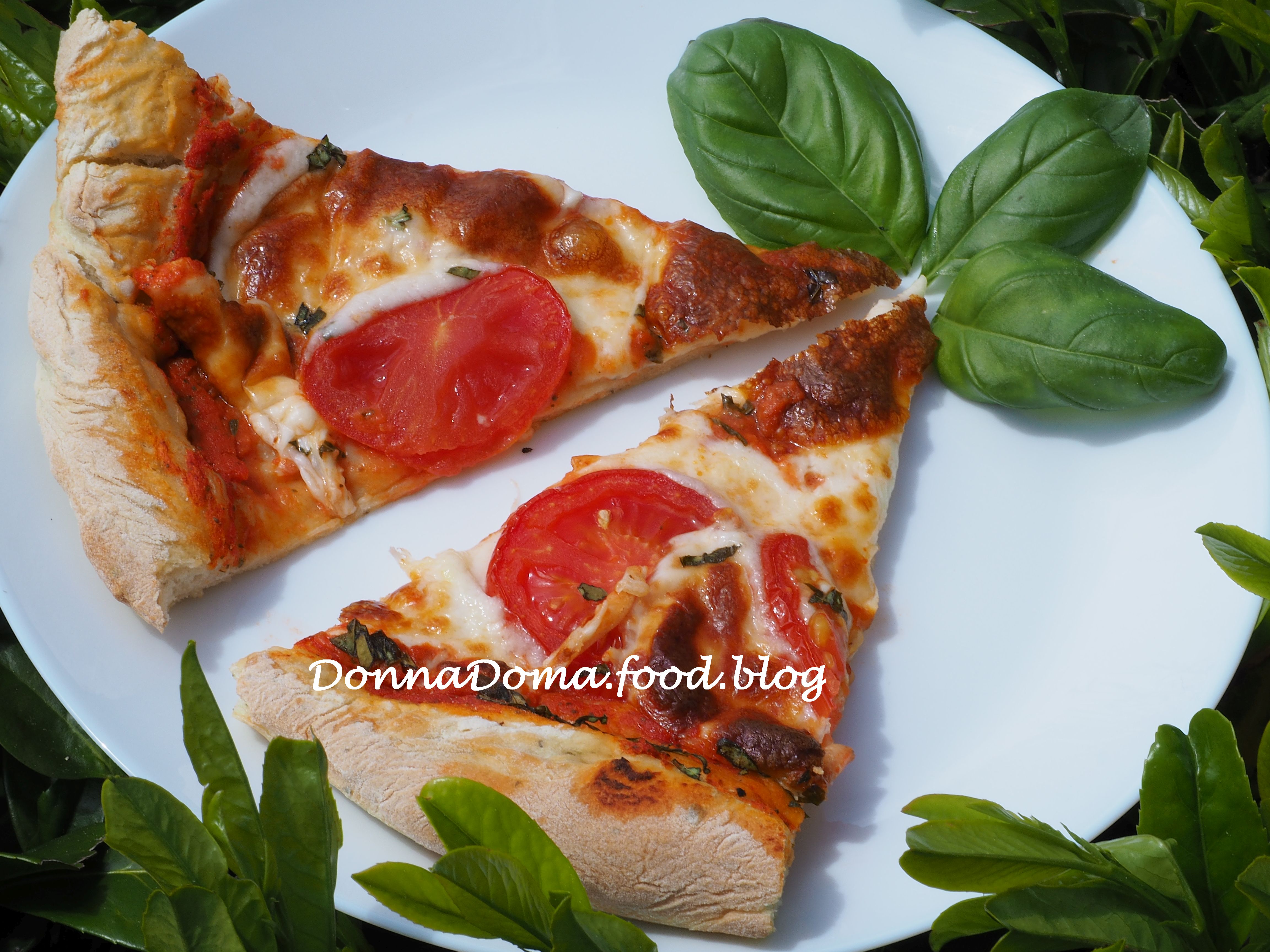 Ezalatt maximum hőfokra előmelegítem a sütőt. Egy magas mérőedénybe öntöm a pizzaszósz alapanyagait és botmixerrel összeturmixolom. Megmosom, felkarikázom a paradicsomot, felaprítom a sajtot és a bazsalikomleveleket. A pizzákat megkenem kb. 4 ek szósszal, megrakom paradicsom- és mozarellaszeletekkel, megszórom bazsalikommal és közvetlenül a sütő rácsára teszem (nem kell alá tepsi). Vastagságtól valamint a sütőben elérhető legmagasabb hőfoktól függően kb. 8-12 perc alatt pirosra, ropogósra sütöm a pizzát.