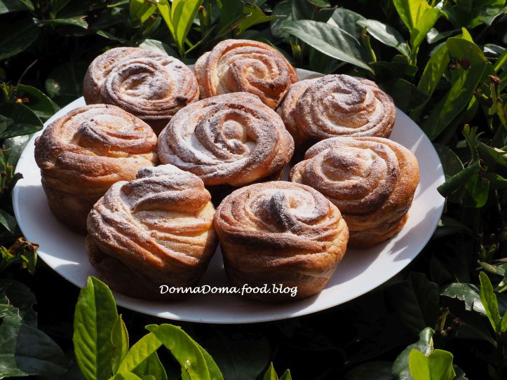 Ha megkelt a tészta, lisztezett deszkán picit átgyúrom, majd kettéosztom, a felét 6 egyforma gombócra osztom. A gombócokat kb. 10 centi széles és 30 centi hosszú csíkokra nyújtom, közben folyamatosan lisztezem, hogy ne ragadjanak le. A másik felével ugyanígy járok el. A csíkokat megkenem egy evőkanálnyi mascarponéval, majd egy evőkanálnyi eperpürével/eperlekvárral, és a keskenyebb végénél kezdve feltekerem, mint a palacsintát. A “palacsintákat” egy tálcára sorakoztatom és fél órára hűtőbe teszem, hogy szilárduljon a töltelék. Azután kiveszem, hosszában félbevágom, a vágási felületet felfelé fordítom és elkezdem feltekerni, mint a csigát. (Ahogyan a másik cruffin receptem fotóin látható: https://donnadoma.food.blog/2020/05/12/cruffin-csokis-mogyoros-es-fahejas-csiga-muffinsutoben/). Az utolsó körnél már kifelé fordítom a vágási felületet, hogy az oldala is csíkos legyen. Kivajazott muffinformába teszem a csigákat és 2 órán át kelni hagyom.