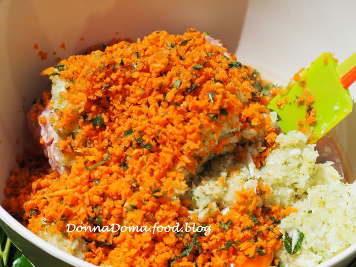 Az összes zöldséget (vöröshagyma, fokhagyma, sárgarépa, cukkini) megpucolom (a cukkini héját rajta hagyom) és lereszelem vagy aprítógépben felaprítom. A petrezselymet és a bazsalikomot finomra vágom (ha aprítógépet használok, akkor ezeket is simán beleszórom a zöldségekkel együtt). Egy nagy tálba szórom, hozzáadom a darált húst, (a tojást), sózom és bőven megszórom frissen őrölt borssal.