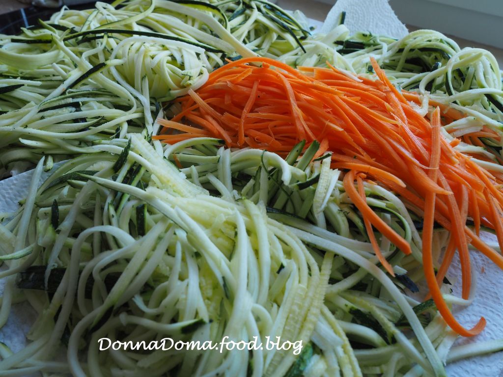 Amíg sül, megmosom a cukkinit, két végét levágom, de nem hámozom meg. Deszkára fektetem és a cukkinivágóval hosszanti irányban, vízszintesen húzgálva hosszú csíkokra vágom. (A cukkinivágóról leírás, fotó itt: Cukkinispagetti) A sárgarépát meghámozom és szintén csíkokra vágom. A két zöldséget külön papírtörlőre teszem, megsózom (ehhez a mennyiséghez kb. 1 csapott ek. sót használtam fel), és finoman átkeverem. Kb. 15 percig békén hagyom, hogy a papír felszívja a nedvességet és a zöldségeket átjárja a só.