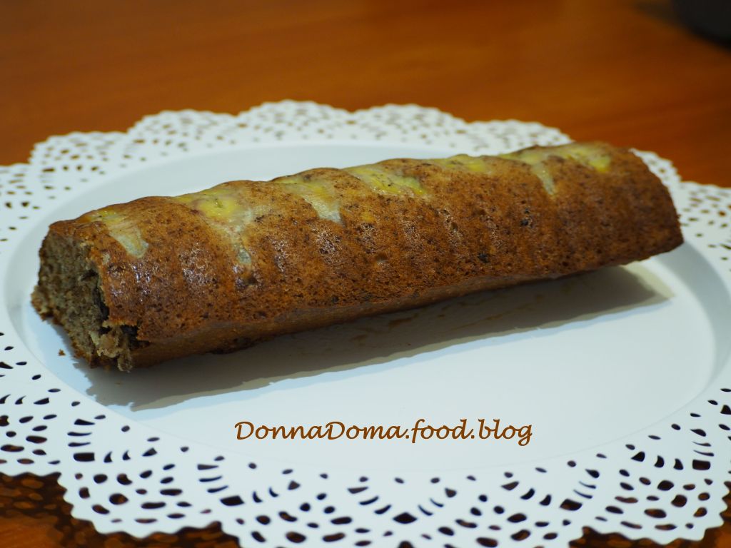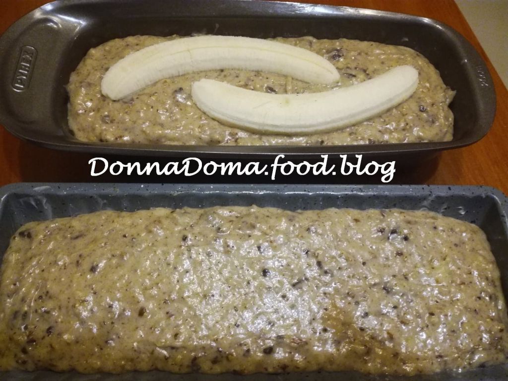 A formákat kivajazom, beleöntöm a masszát, a két forma között egyenlően elosztva, a tetejére félbe vagy karikákra vágva tehetek még banánt díszítésnek (én most az őzgerincnek az aljára nyomkodtam banánkarikákat, erre öntöttem a tésztát, a másik formának a tetejére raktam egy hosszában kettévágott banánt). Az előmelegített sütőben, középső rácson sütöm. Sütőtől és a formák méretétől függ a sütési idő, ki kell tapasztalni: nekem a kisebb, őzgerinc formának 25, a nagyobb, kenyérsütő formának kb. 40 perc kellett. Addig sütjük, míg a beleszúrt tű már nem tojásos-ragacsos, de még nedves, vagy amíg ujjal megnyomva a tetejét már nem nyomódik be, hanem ruganyos, szivacsszerű. Az edényben hagyom langyosra hűlni, utána kiborítom és vastag szeletekre vágom.
