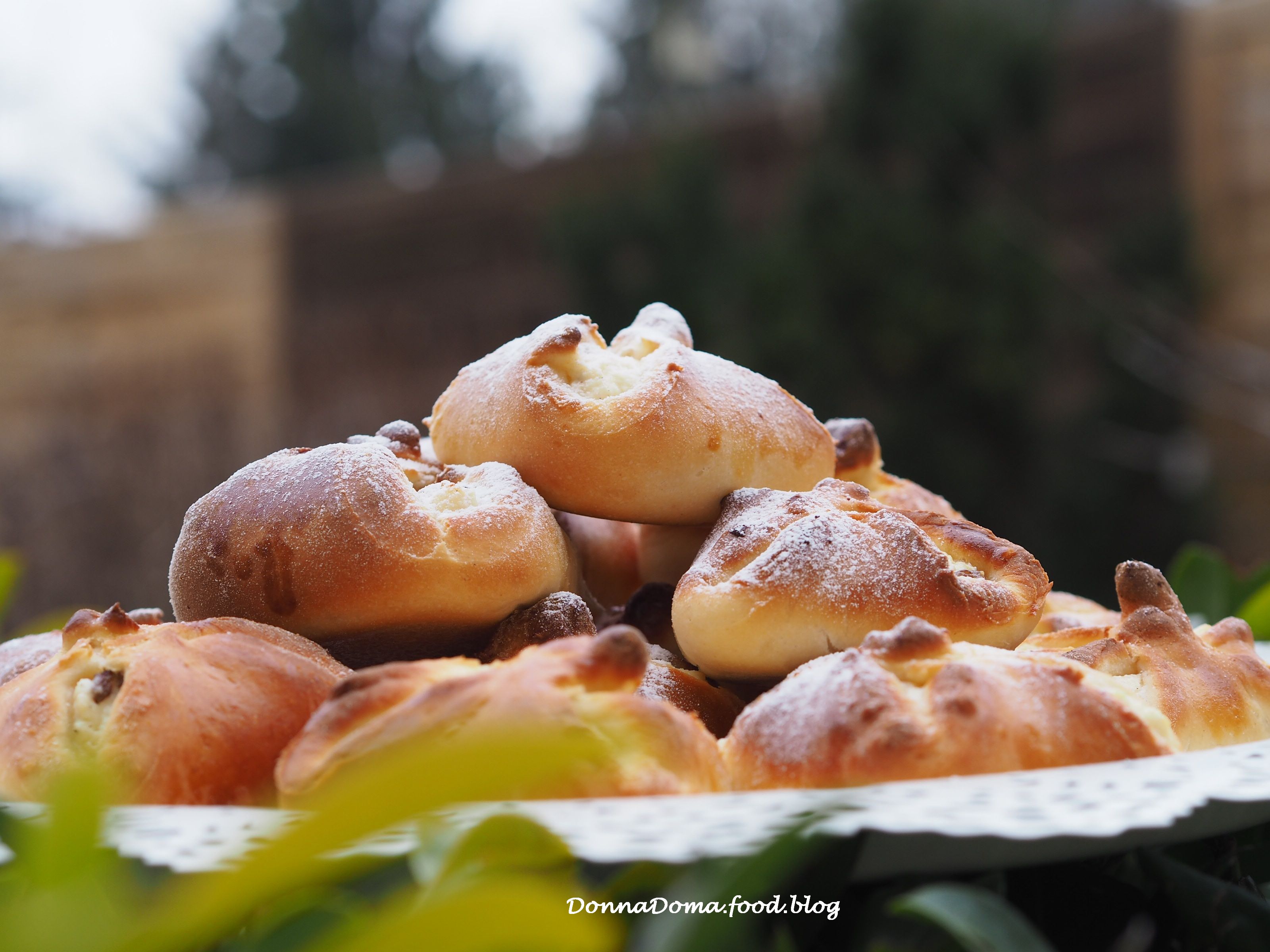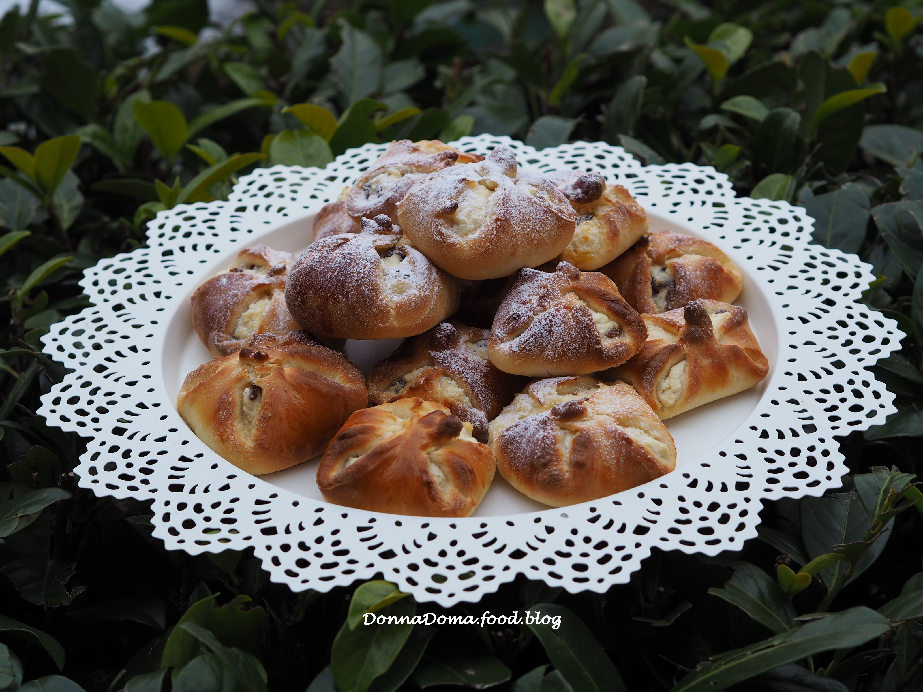 Ha duplájára kelt a tészta, lisztezett deszkán kb. 50×40 cm-esre nyújtom, majd 8×8 cm-es négyzetekre vágom. Mindegyik négyzet közepére halmozok egy evőkanálnyit a túrótöltelékből, majd a négyzet két átellenes sarkát összefogom, utána a másik kettőt hozzá, és a négy sarkát erősen összenyomva csavarok egyet rajta (ha nem nyomom össze erősen, akkor kelés és sütés közben szétnyílnak a batyuk). Az így keletkezett batyukat két, sütőpapírral bélelt, legnagyobb méretű tepsibe sorakoztatom, egymástól tisztes távolságban, mert meg fognak még nőni. A tojássárgáját a tejjel összekeverem, és ecsettel lekenem a batyukat (csak a tésztás részt, a túrót nem kell). Fél órán át meleg helyen kelesztem. Ezután előmelegítem 180 fokra, légkeverésen a sütőt, és a két tepsit együtt kb. 15 perc alatt megsütöm a forró sütőben. Akkor jó, ha szép aranybarna a színe (ha az alsó tepsi tartalma nem pirult meg, akkor magasabbra teszem és még 4-5 percig sütöm, miután a felsőt kivettem.)