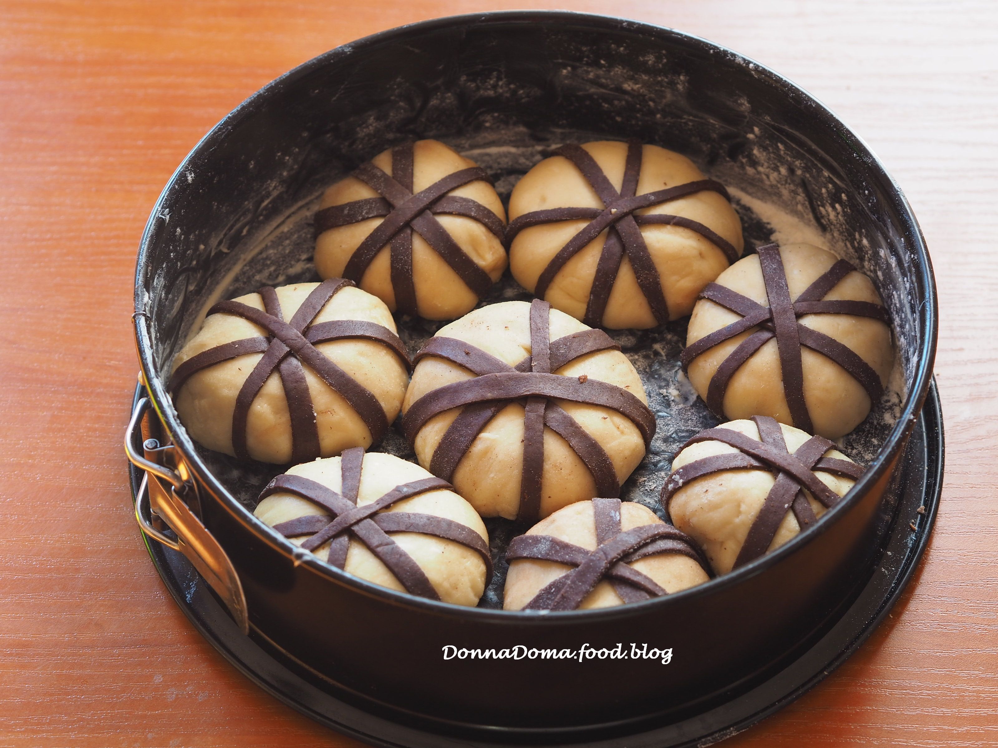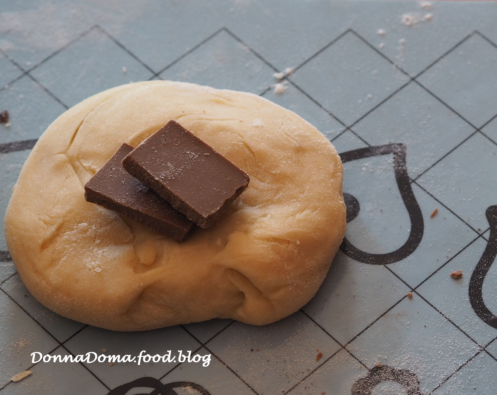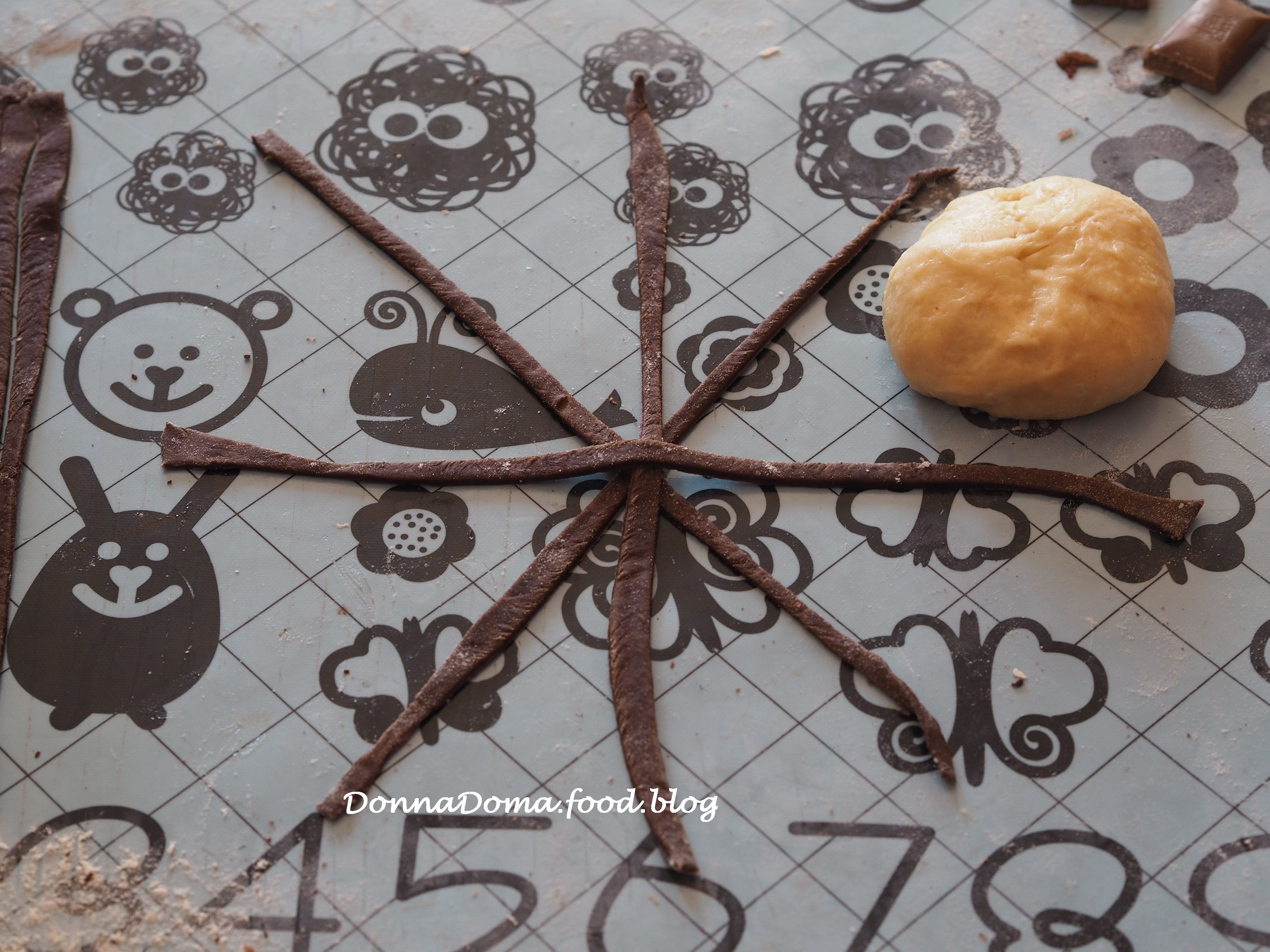 A tészta összes hozzávalóját kenyérsütőgépbe szórom és dagasztóprogrammal megdagasztom és megkelesztem. Vagy egy nagy tálban szórom és kézzel kidagasztom és duplájára kelesztem (kb. 1-2 óra, hőmérséklettől függően). A megkelt tésztát 9 egyenlő részre vágom, az egyiket egy tálba teszem, rászitálom a színezéshez szánt kakaóport és addig gyúrom, amíg egyenletesen eloszlik. A színezett gombócot deszkán vékonyra, kb. 20*20 cm-es négyzetre nyújtom, és kb. fél cm széles, hosszú csíkokra vágom (32 csíkra lesz szükség, én félbe, megint félbe és így tovább szoktam vágni, hogy egyformák legyenek a csíkok). A másik 8, fehéren maradt részt egyenként kilapítom, elrejtek benne 2-2 kocka ét- vagy tejcsokoládét, majd összecsípem és gombócot formálok belőle.