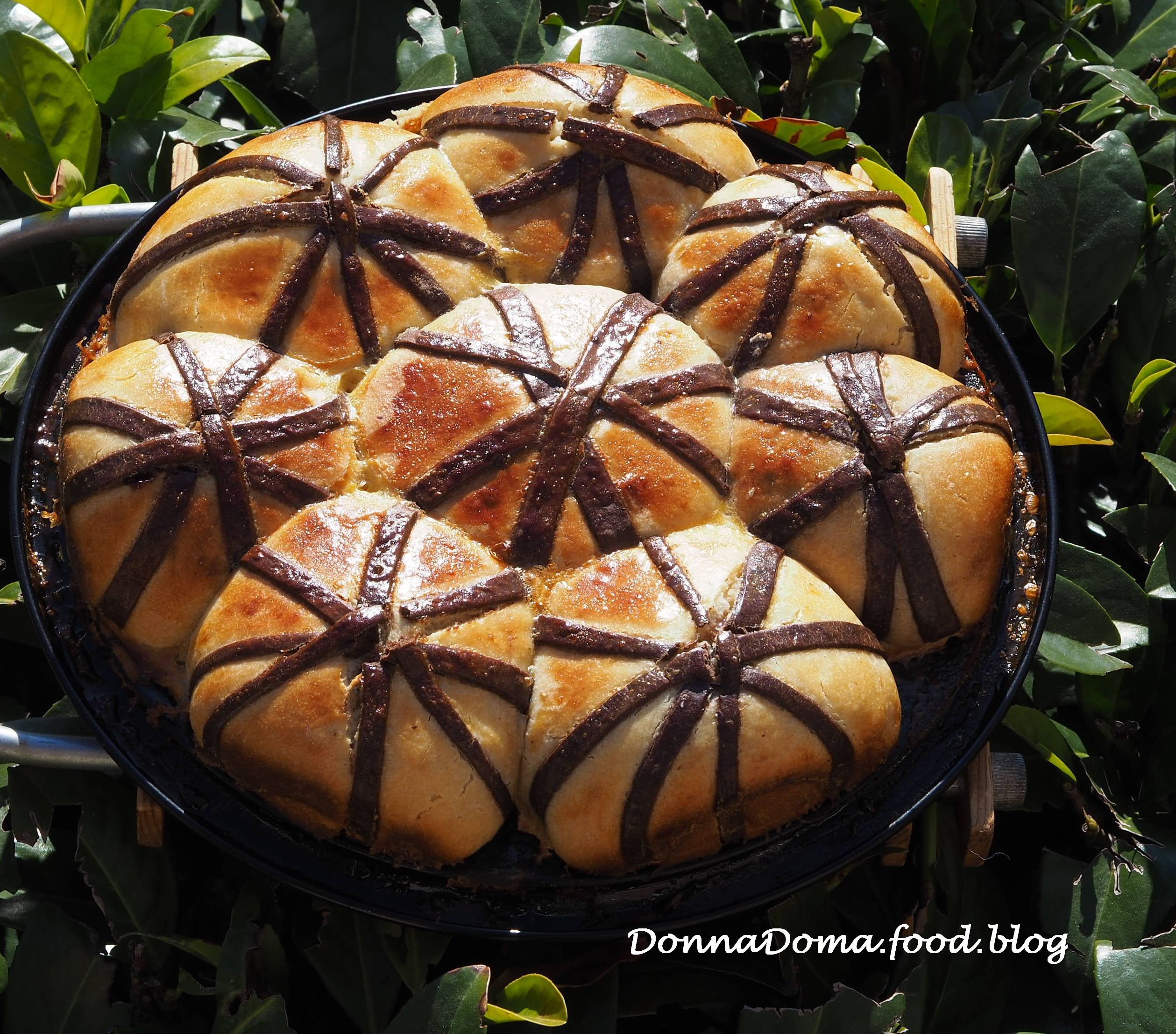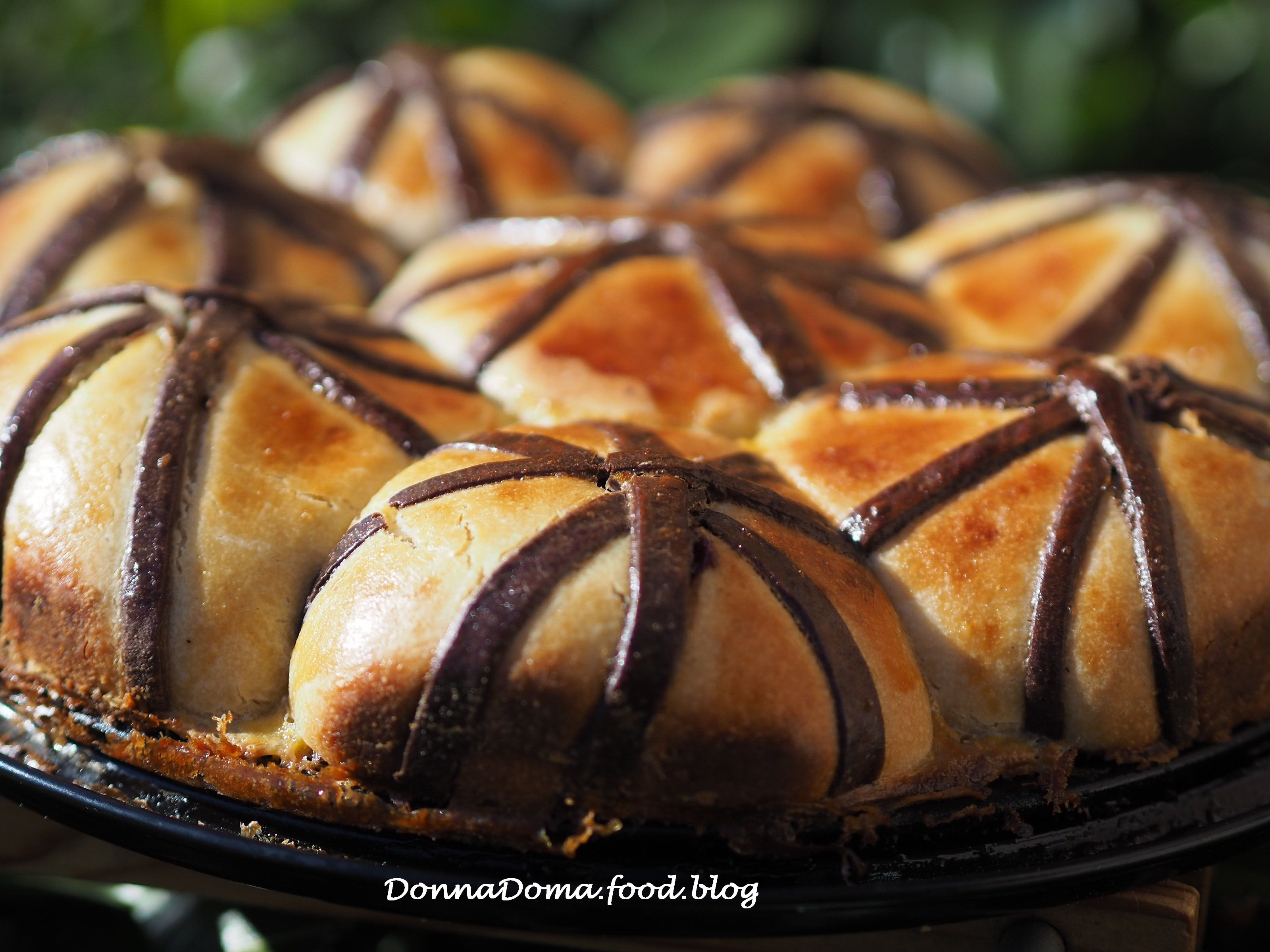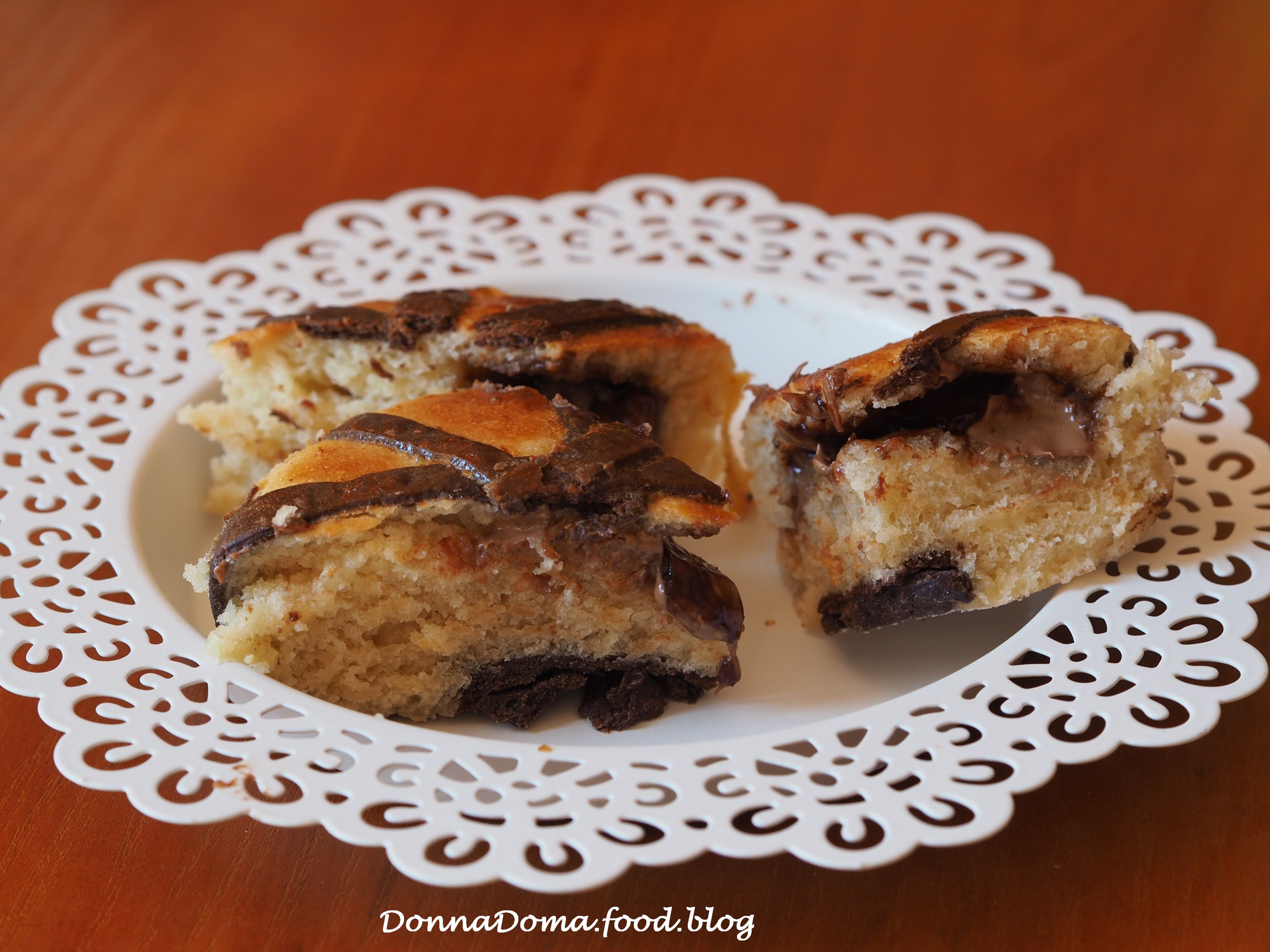 Az a meglepetés, hogy mindegyik briós belsejében olvadt csokoládé lapul 😊 Egy gasztrovideóban láttam és megtetszett. Az ajándékcsomagoló masnira hasonló színes csíkok nagyon mutatóssá teszik ezt a foszlós, pihe-puha kalácsot. Én növényi tejből (kókusztejből) készítettem és nagyon finom lett.