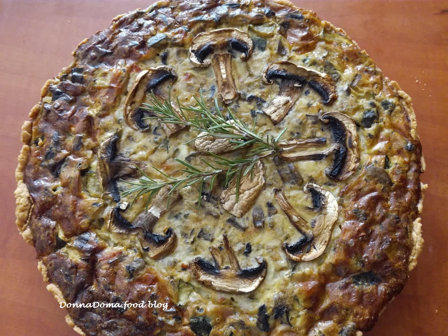 Közben felkockázom a hagymát, megtisztítom és felkockázom a gombát (2-3 gombát szép szeletekre vágok és félreteszem a díszítéshez), a cukkinit és a paradicsomot. Az olajat egy serpenyőben felhevítem, üvegesre párolom benne a hagymát. Majd ráöntöm a gombát és kevergetve pár percig sütöm. Ráöntöm a cukkinit és a paradicsomot is, sóval, borssal, kakukkfűvel, rozmaringgal ízesítem, majd lefedve kb. 10 perc alatt puhára párolom. Ha kész, kihűtöm.
