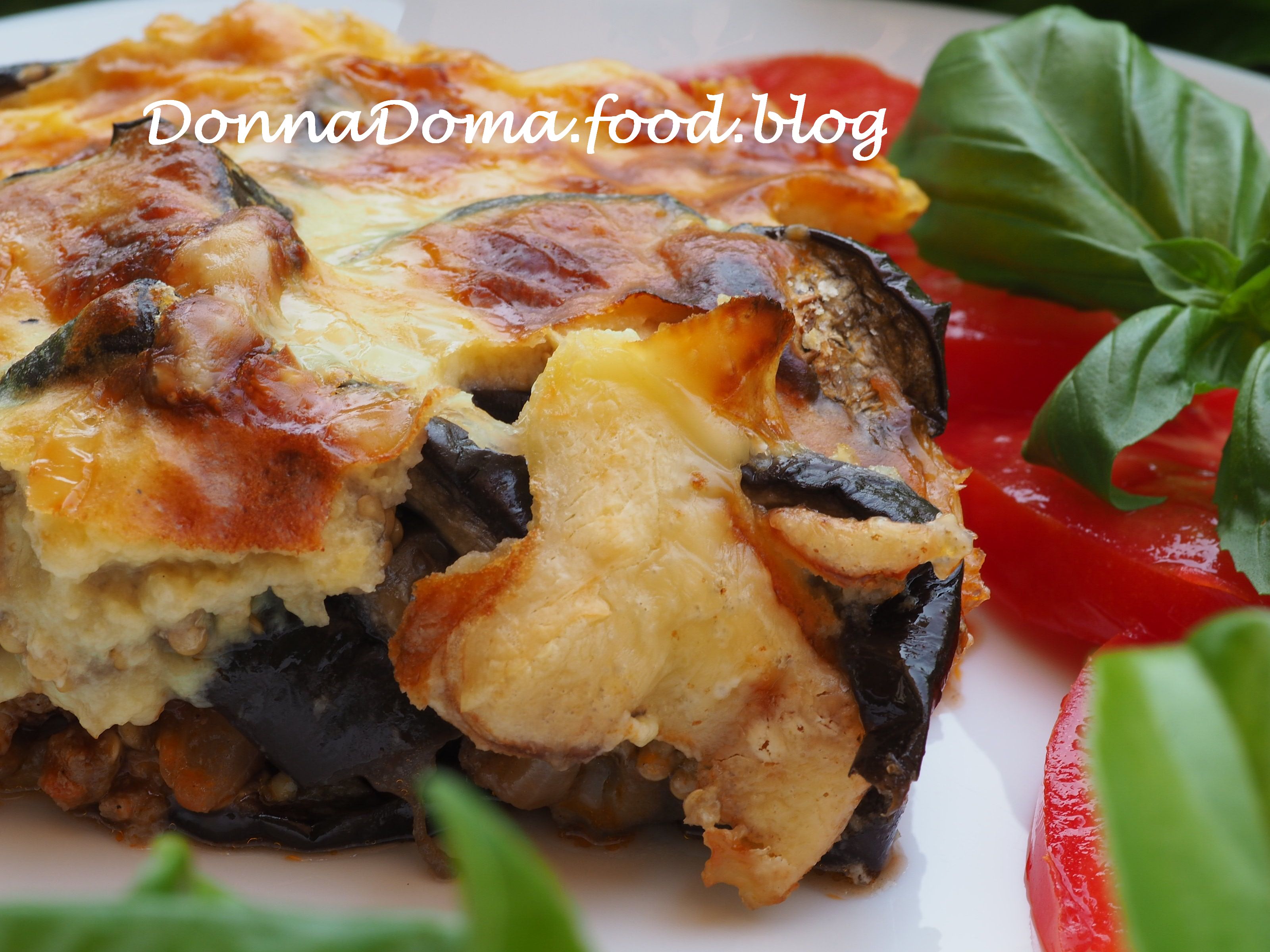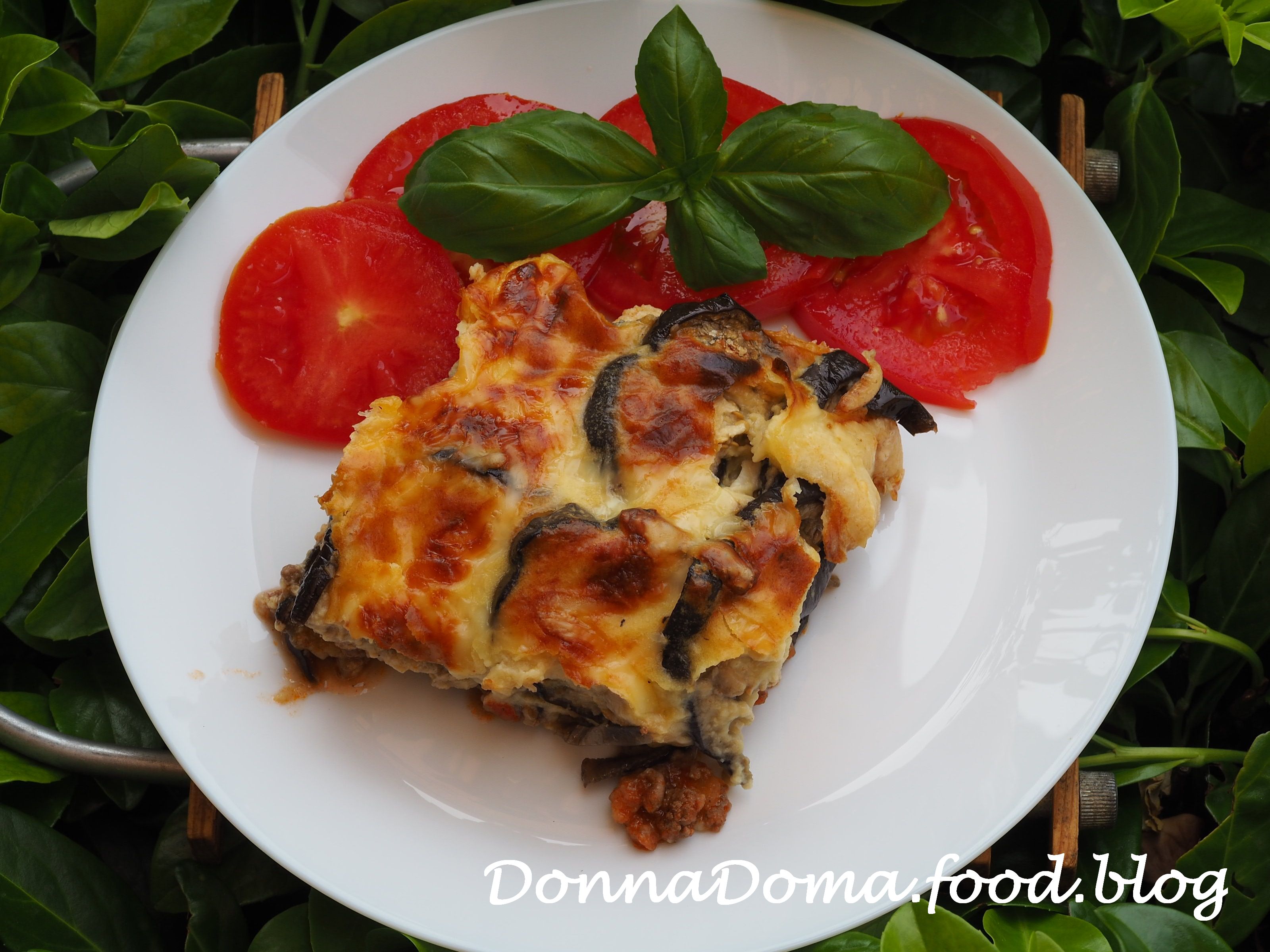 A sütőt 180 fokra előmelegítem, és összeállítom a muszakát. Kiolajozok egy 20×40 cm-es, magas peremű tepsit, és elrendezzem benne a megsütött padlizsánszeletek felét. Rászórom a zsemlemorzsa felét, rásimítom a paradicsomos darált húst, és befedem a maradék padlizsánszeletekkel. Rászórom a maradék zsemlemorzsát, rákenem a tojásokkal dúsított besamelmártást, és az egészet megszórom a maradék reszelt juhsajttal. Kb. fél óra alatt sül aranybarnára a sütőben.