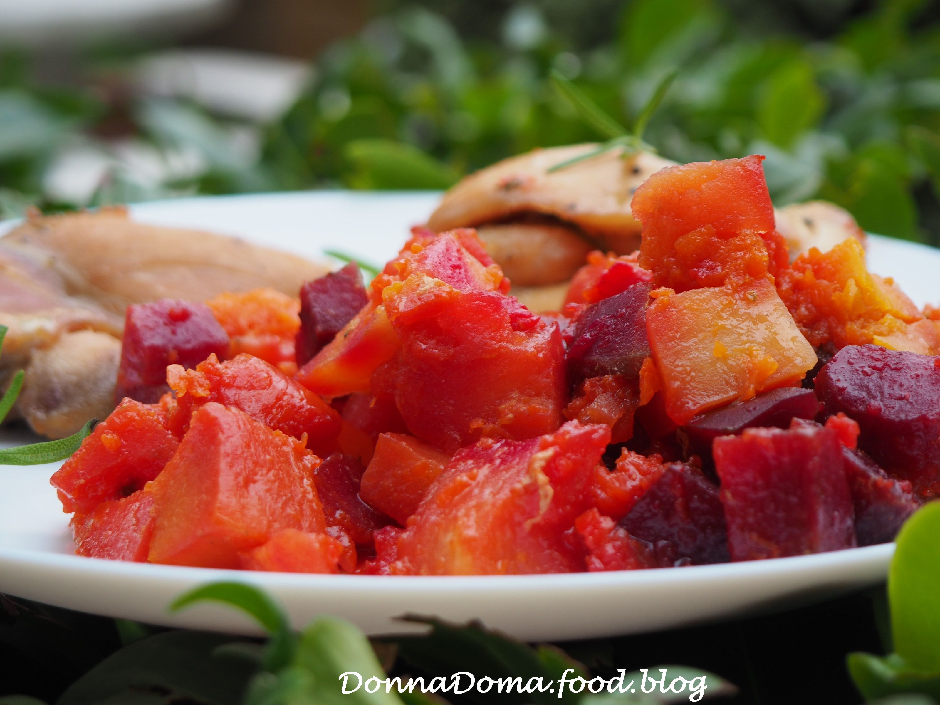 A céklát, a sütőtököt és a burgonyát meghámozom, megmosom, és felkockázom. A sütőtök és a burgonya nagyobb, a cékla kisebb (kb. fele akkora) kockákban legyen, így fog egyszerre megpuhulni, mert a céklának hosszabb a sütési ideje.