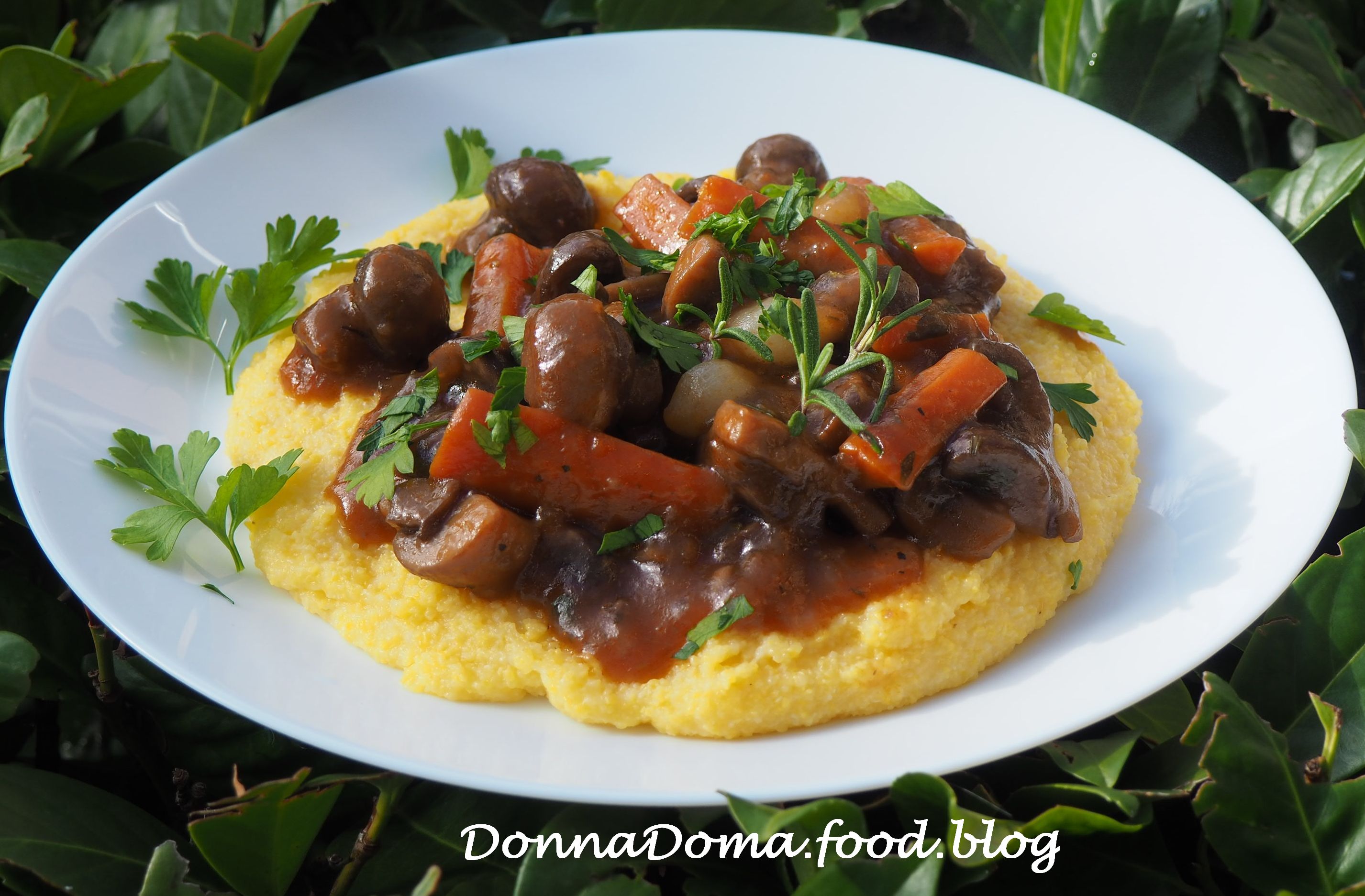 A polentához felforralom a vizet, beleteszem a sót és az olajat, kis lángra kapcsolom, majd egyik kezemmel vékony sugárban öntöm bele a kukoricadarát, másikkal kézi habverővel folyamatosan keverem, hogy ne csomósodjon össze. Továbbra is kis lángon, folyamatosan keverem, míg elválik az edény falától, és gombóccá áll össze. Ekkor tányérokba osztom és rászedem a gombás finomságot, majd petrezselyemmel szórom meg a tetejét. (Ha sok időm van, egy tepsibe kiöntöm, hagyom megszilárdulni, kihűlni, majd kockára vágom és sütő grillfokozatán meggrillezem a polentát.)