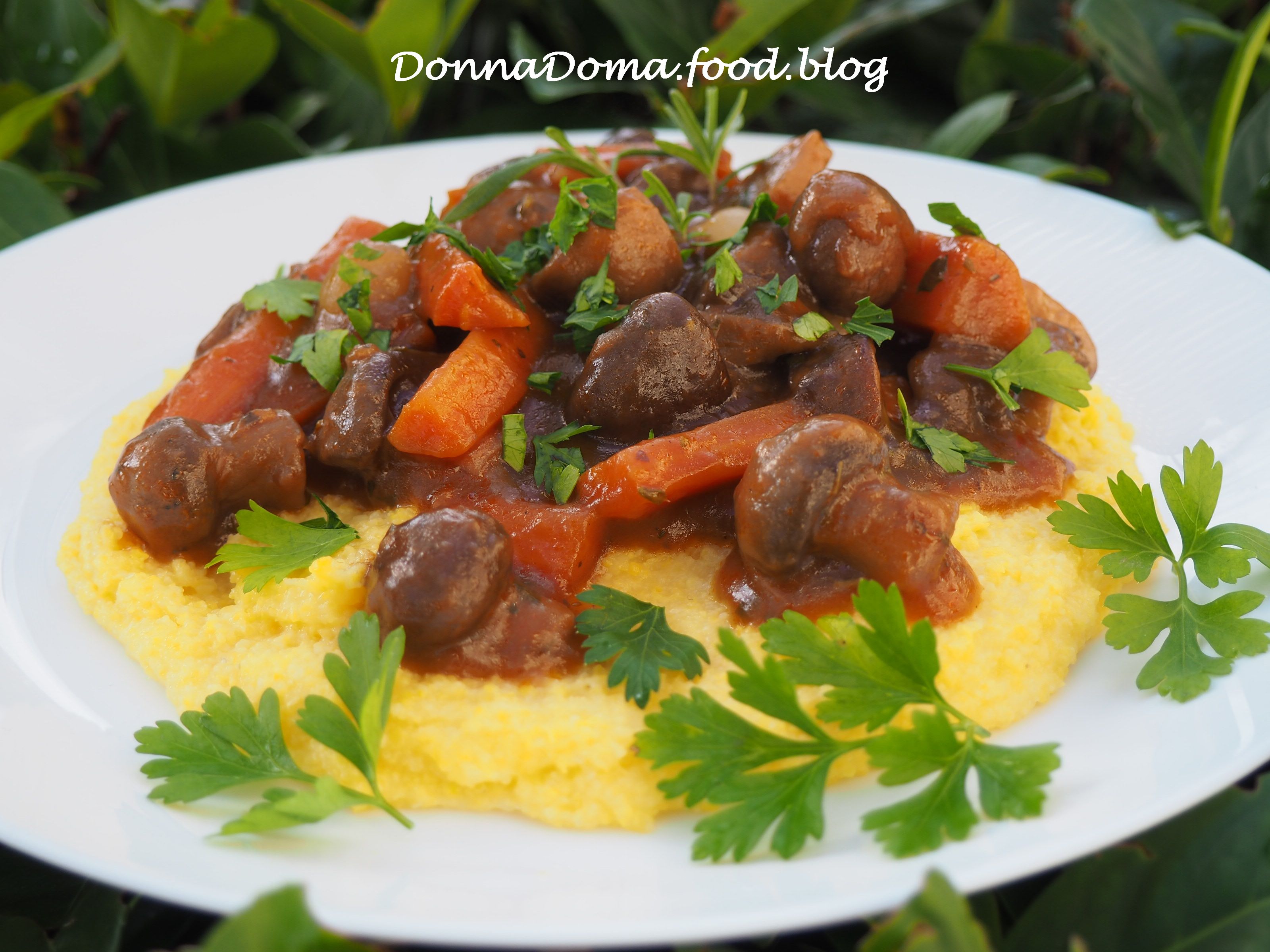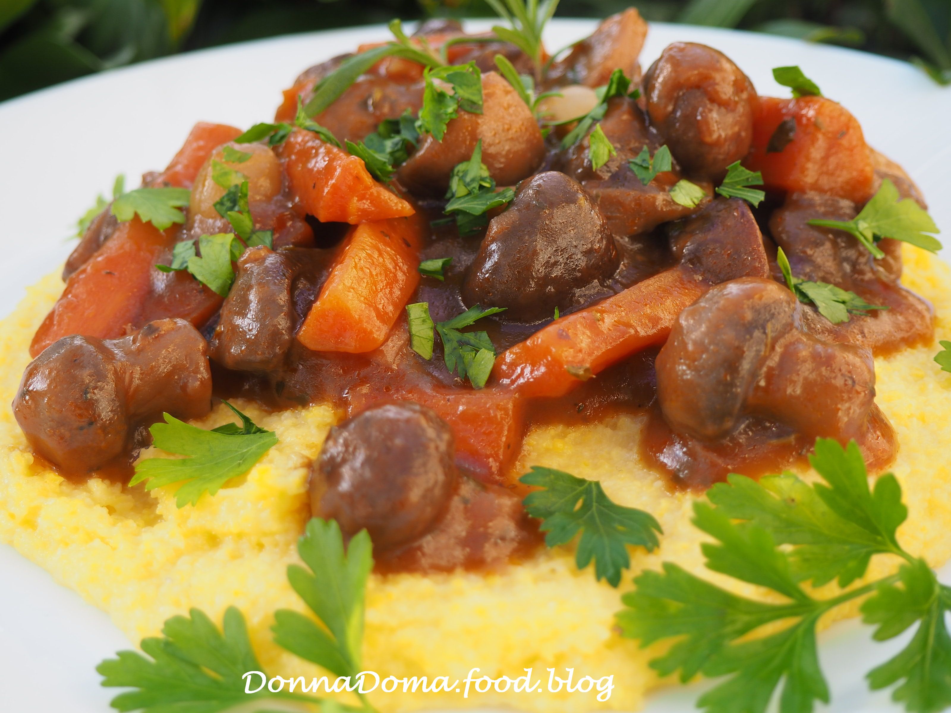 Ez a népszerű boeuf bourguignon (burgundi marha) vegetáriánus, sőt vegán változata (ide kattintva megtalálod annak a receptjét is a blogomon). Csodálatosan gazdag, csillogó és vörösboros a szaftja, és nem mellesleg egy szűk óra alatt elkészül, szemben húsos társával. Látványos, elegáns étel, ünnepi alkalomra, vendégek elkápráztatására is kiváló, ugyanakkor egyáltalán nem bonyolult az elkészítése. Köretnek ezúttal polentát készítettem hozzá, de krumplipürével is kitűnő.