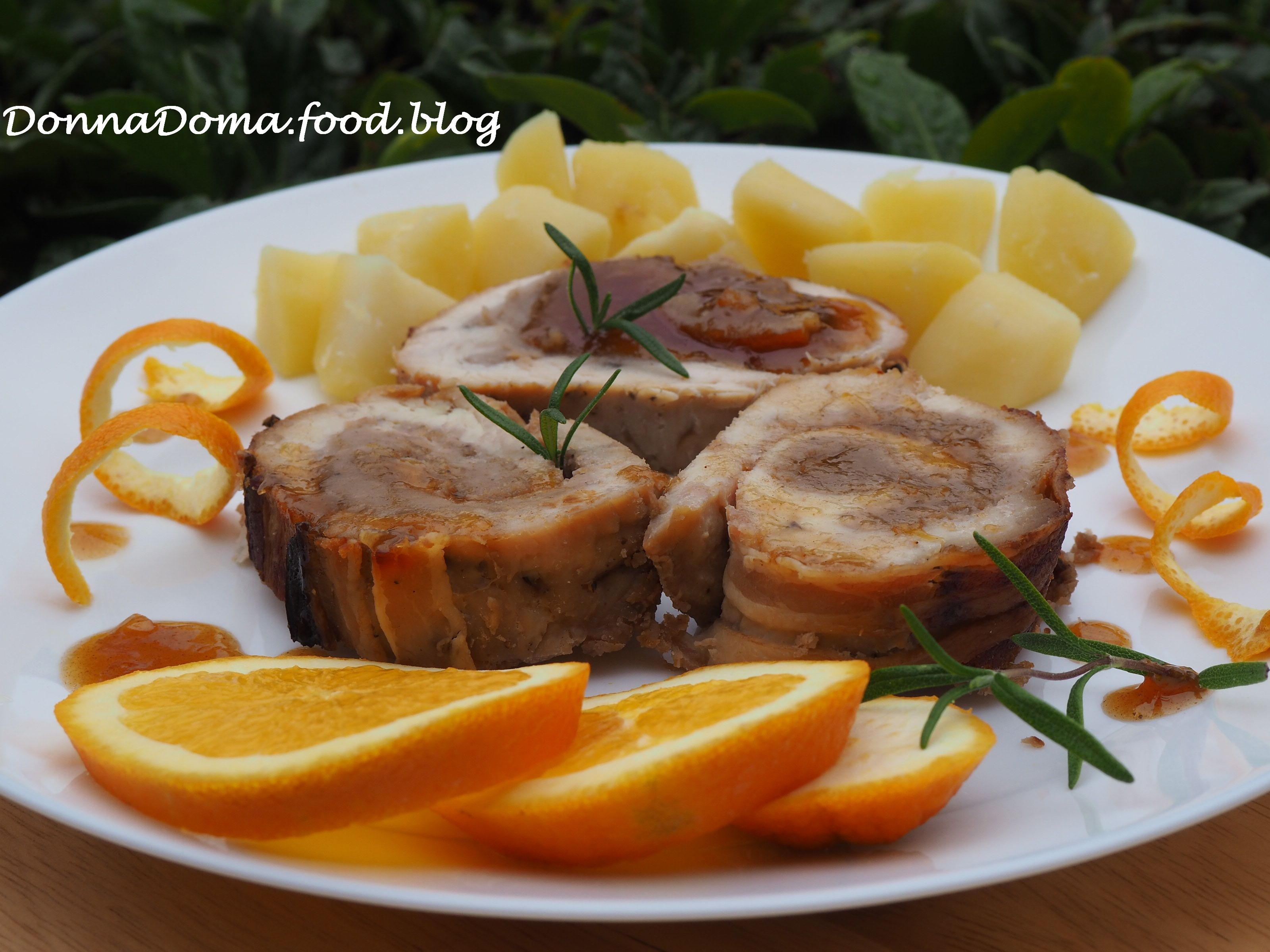 Ha pirosra, ropogósra sült a bacon, a félretett mázzal meglocsolom, majd deszkán szeletekre vágom, és főtt burgonyával és a narancsmártással jól meglocsolva tálalom a szépséges gesztenyés tekercseket.
