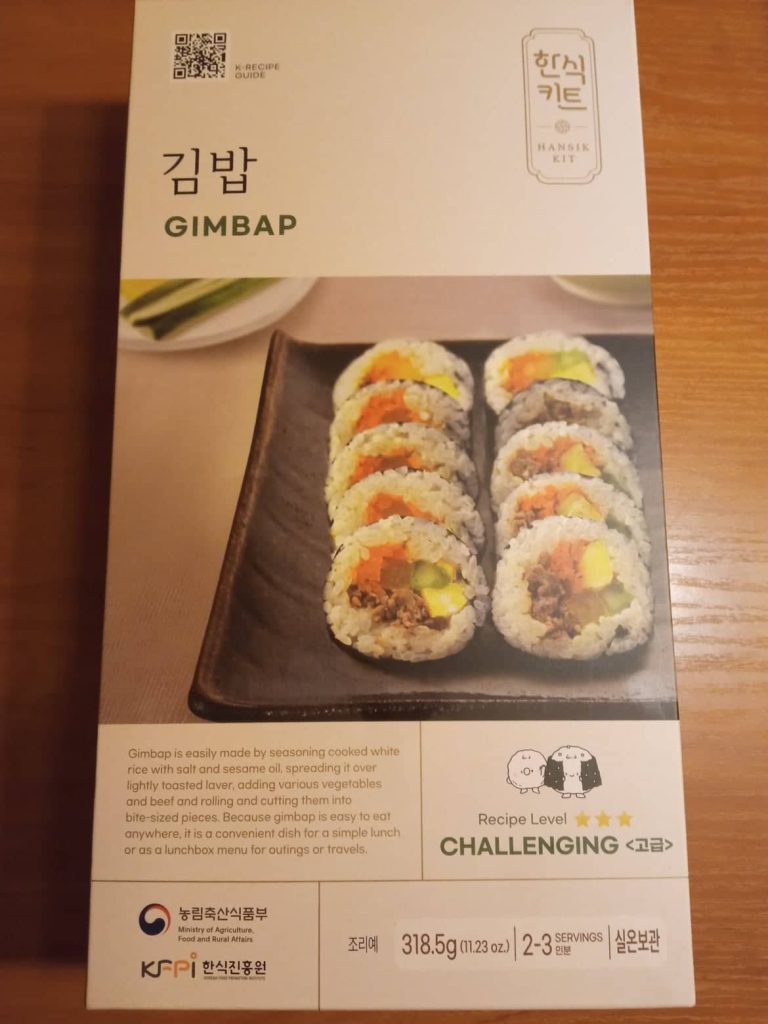 A Koreai Kulturális Központtól kapott készletből most itthon is készült gimbap. A dobozon található QR-kódon megtekinthető egy receptvideó (koreai hanggal, angol felirattal): https://www.youtube.com/watch?v=nNRT4KDbgXg&feature=youtu.be. Ezt és a dobozban található angol nyelvű receptfüzetet alapul véve készítettem el az ételt (a receptvideóban és a receptfüzetben marhahúsos változat szerepel, de én most egy tonhalas verziót készítettem). A dobozokat a Korean Food Promotion Institute készítette, hogy bemutassa a koreai konyha sokszínűségét. További információ az intézetről angol nyelven: http://www.hansikmagazine.org/ https://www.facebook.com/hansikkorea/.