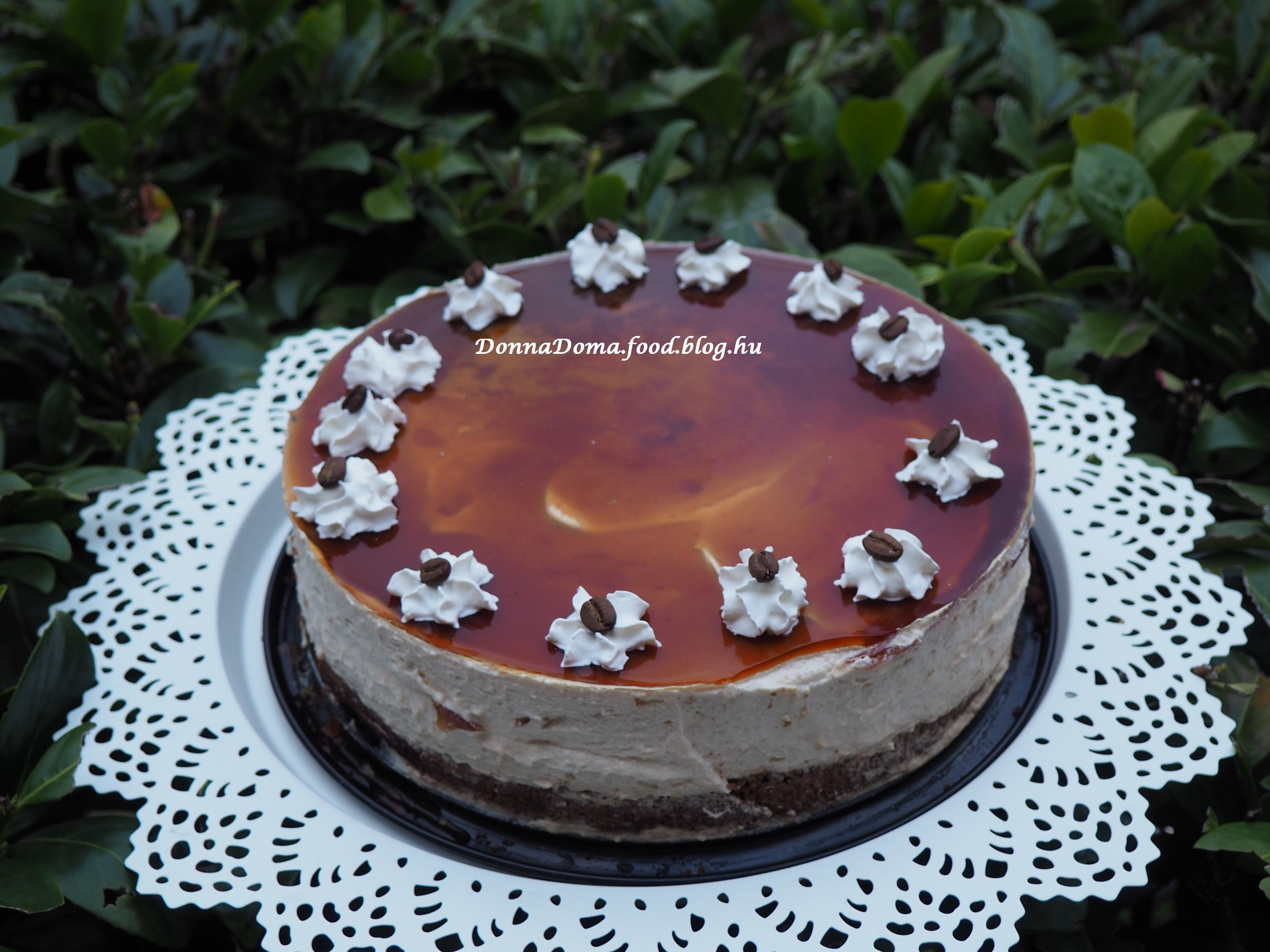 A sütőből kivéve kihűtöm, közben elkészítem a krémet. Megfőzöm a kávét és hűlni hagyom. A fehér csokit gőz fölött felolvasztom. Félig felverem a cukrászhabot, majd beleszórom a zselatint és készre verem. Egy másik edénybe öntöm a mascarponét, hozzáöntöm a vaníliakivonatot, a kihűlt kávét és az olvasztott csokoládét és robotgéppel alacsony fokozaton addig verem, míg homogén masszát kapok. Hozzáadom a tejszínhabot és a két krémet alacsony fokozaton összevegyítem. Ha ez is homogén, a kihűlt tésztát körbevágom, leveszem róla a tortakarikát, az aljáról is leválasztom, majd visszateszem és ráöntöm a habot. Hűtőbe téve minimum 2 órán át hagyom dermedni.