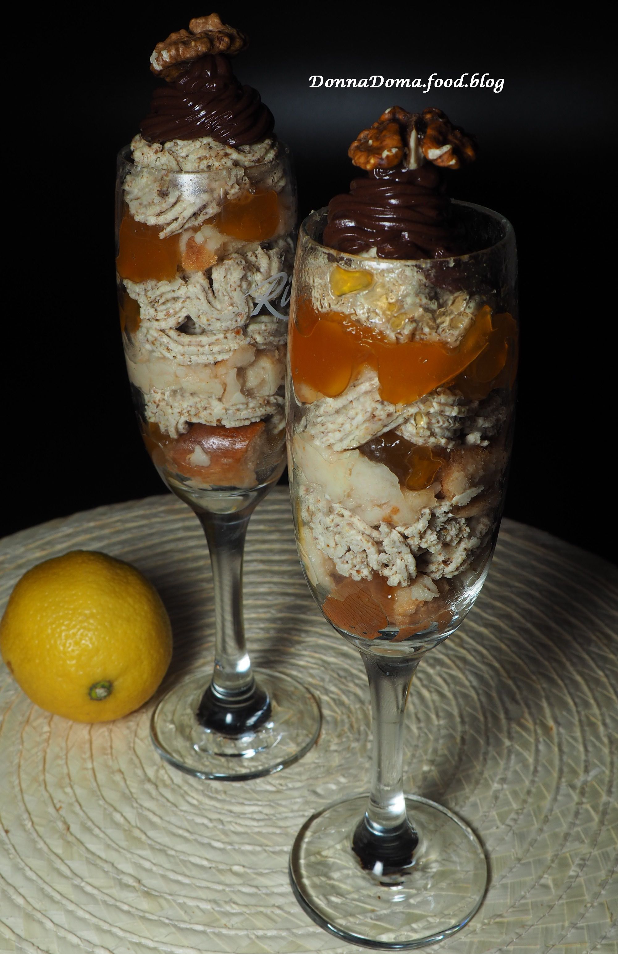 5 szép kehelybe vagy nagyobb borospohárba rétegzem a finomságot: egy réteg beáztatott kalács, rá 2-3 kk baracklekvár, majd habzsákból a diós krém, és így tovább. Ha sietek, vagy nincs kedvem habzsákkal maszatolni, nyugodtan kanállal is adagolható a diós krém. A végén a csokis masszát teszem a habzsákba és csokis habrózsákat nyomok a poharak tetejére.