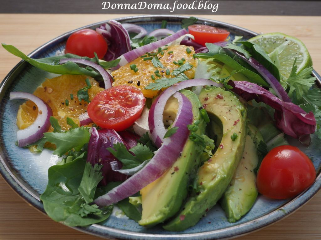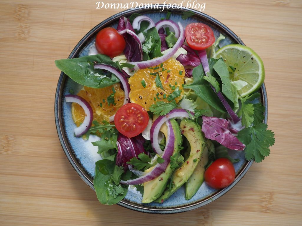 Elkészítés: a zöld leveles összetevőket egy nagy tálba szórom és összekeverem. Az avokádót félbevágom, evőkanállal kivájom a héjából, magját kiszedem és felszeletelem. A narancsot késsel meghámozom (mint a burgonyát), úgy, hogy a fehér, belső héját is eltávolítom, majd felkarikázom. A koktélparadicsomot félbevágom, a lilahagymát elfelezem és hártyavékony szeletekre vágom. Mindet a salátára halmozom, majd összekeverem a dresszing hozzávalóit és rálocsolom.