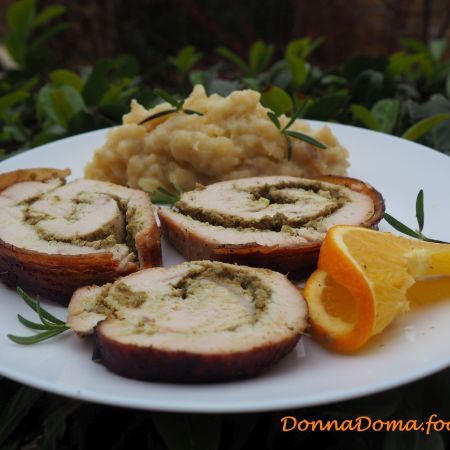 Rozmaringos, baconba tekert csirkecombfilé hagymával és almával